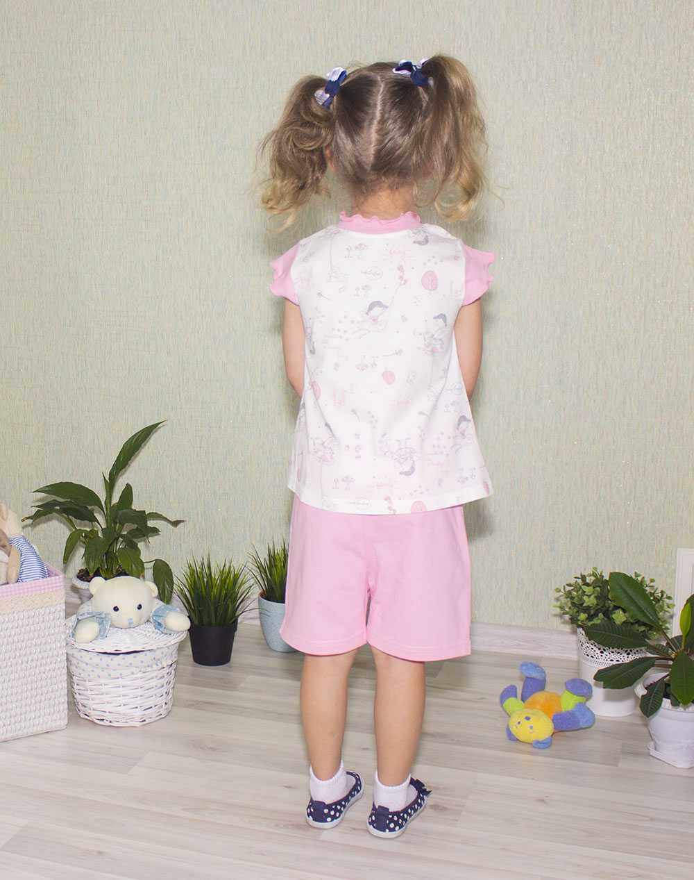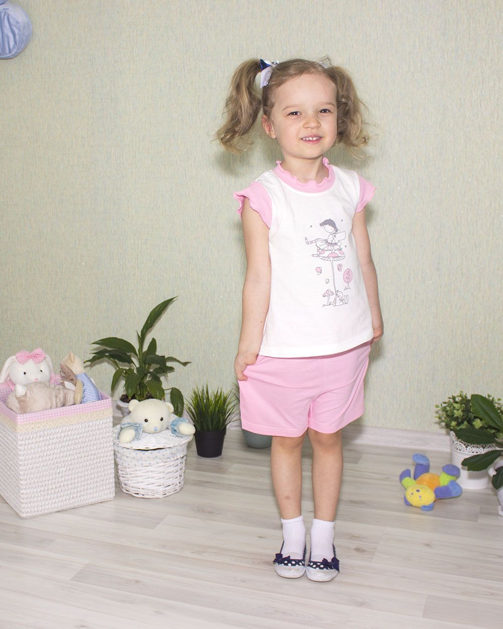 118-65П Комплект для девочки: футболка и шорты "ФЕЯ" (30/110 - молочный с розовым) |