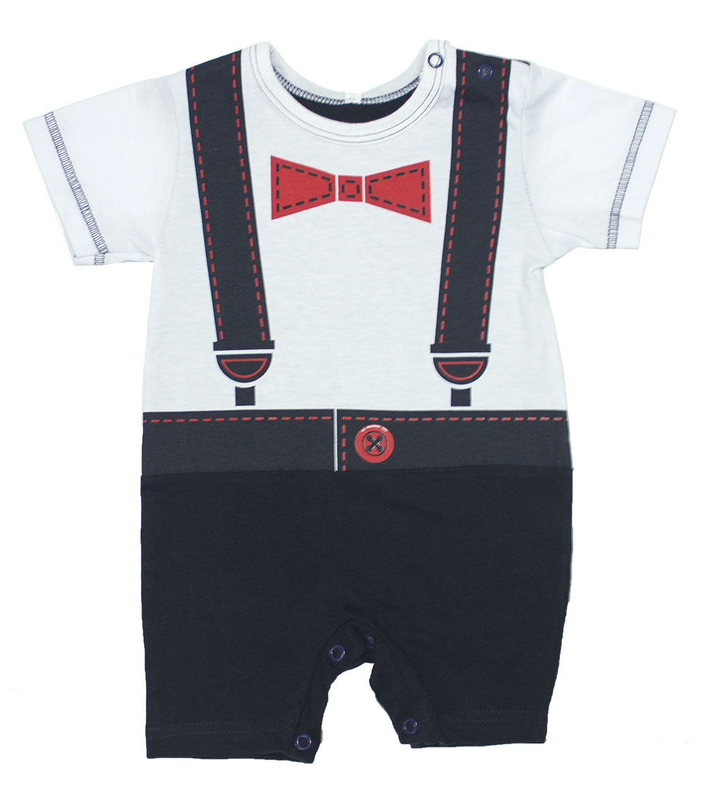Полукомбинезон из коллекции "Юный джентельмен", выполнен из кулира 100% хлопок, украшен печатным рисунком в виде красного галстука-бабочки и подтяжек. Такой комбинезон можно надеть не только на прогулку, но и в гости, потому что оно очень удобный и легкий и одновременно нарядный, модный и стильный.