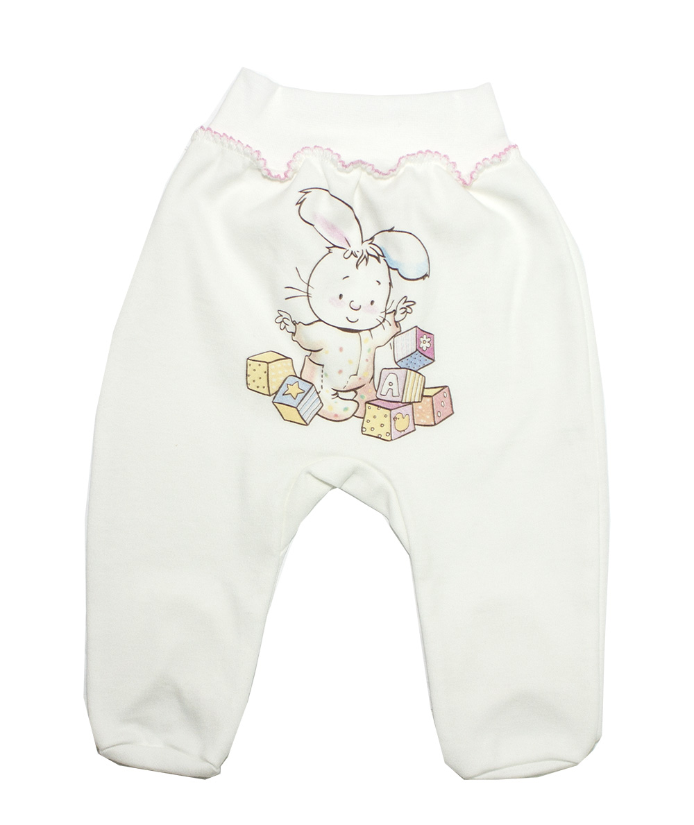 Ползунки "Ушастики" из интерлока. Молочный цвет, полотно высшего качества, наибольший комфорт для самых маленьких, отделка швом крашет, сзади на ползунках печатный рисунок "Зайчик с игрушками". Очень милый и забавный, поднимет настроение. Пояс широкий из рибаны. Отделка крашет розовой (для девочек) ниткой или голубой (для мальчиков).