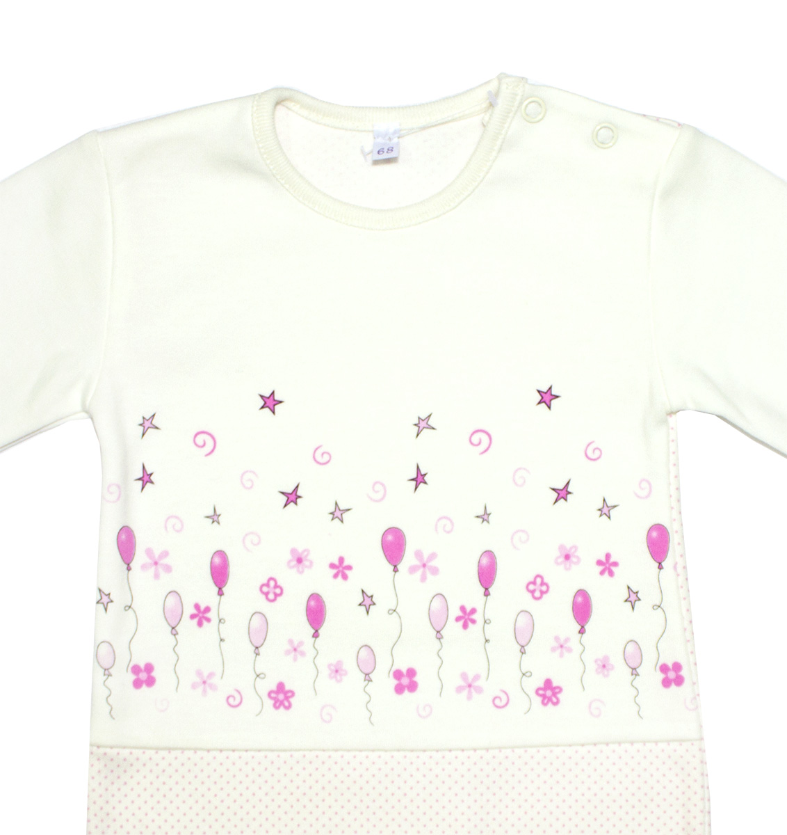 Боди из коллекции "Маусвиль" из интерлока 100% хлопок. На плече 2 кнопки, с дизайнерским печатным рисунком Шарики.
