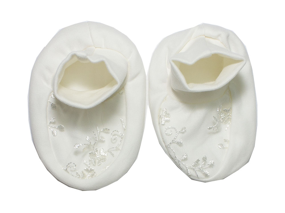 Пинетки для новорожденных из 100% хлопок (интерлок). Украшены вышитым кружевом. Отлично подходят для праздничных и торжественных мероприятий.