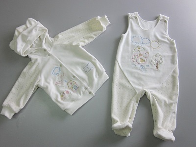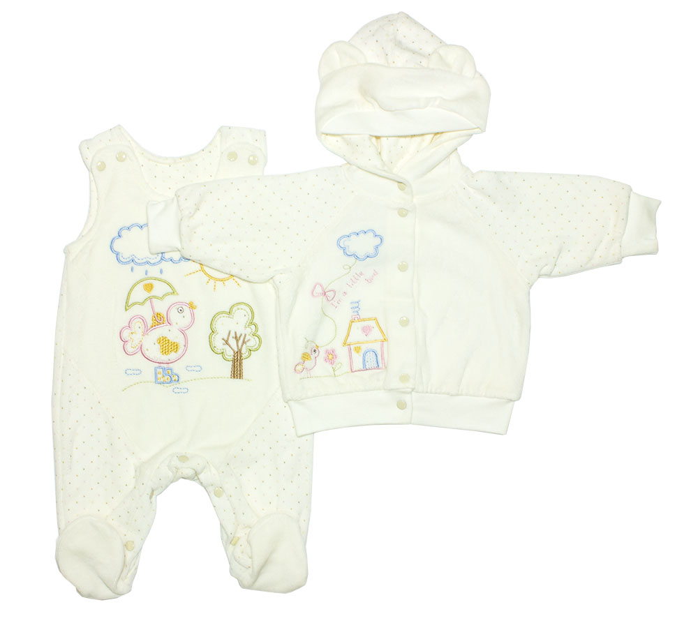 Костюм из мягкого велюра: кофточка на кнопках и капюшоном, полукомбинезон на кнопках. Вышивка есть и на кофточке, и на комбинезоне, которая поднимет настроение маме и малышу. У рукавчиков и капюшона манжеты из рибаны 100 % хлопок.