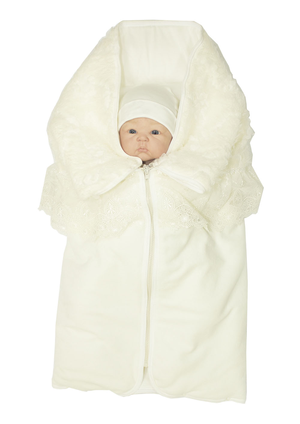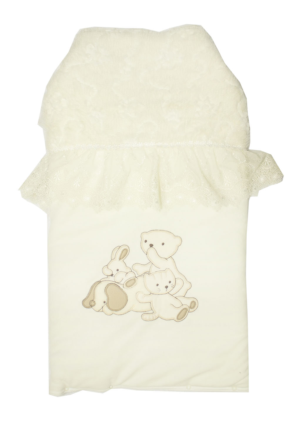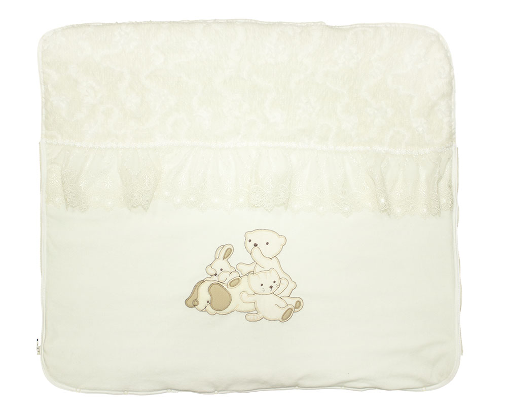 Конверт-плед на молнии. Очень нарядный и вместе с тем и практичный конверт- плед. Праздничность придает фактурный мех и изысканное кружево, а также дизайнерская вышивка "Собачка с друзьми. Практичным конверт делает молния впереди и кнопки, которые конверт в одно мгновение превращают в нарядный элегантный плед, который можно использовать и для уже подросшего ребенка. Подкладом служит трикотажное полотно - кулир (100% хлопок), которое делает этот плед необыкновенно комфортным для малыша, а мягкий нежный велюр сверху делает его комфортным для мам. Антиаллергенный наполнитель не даст малышу замерзнуть в холодную погоду.