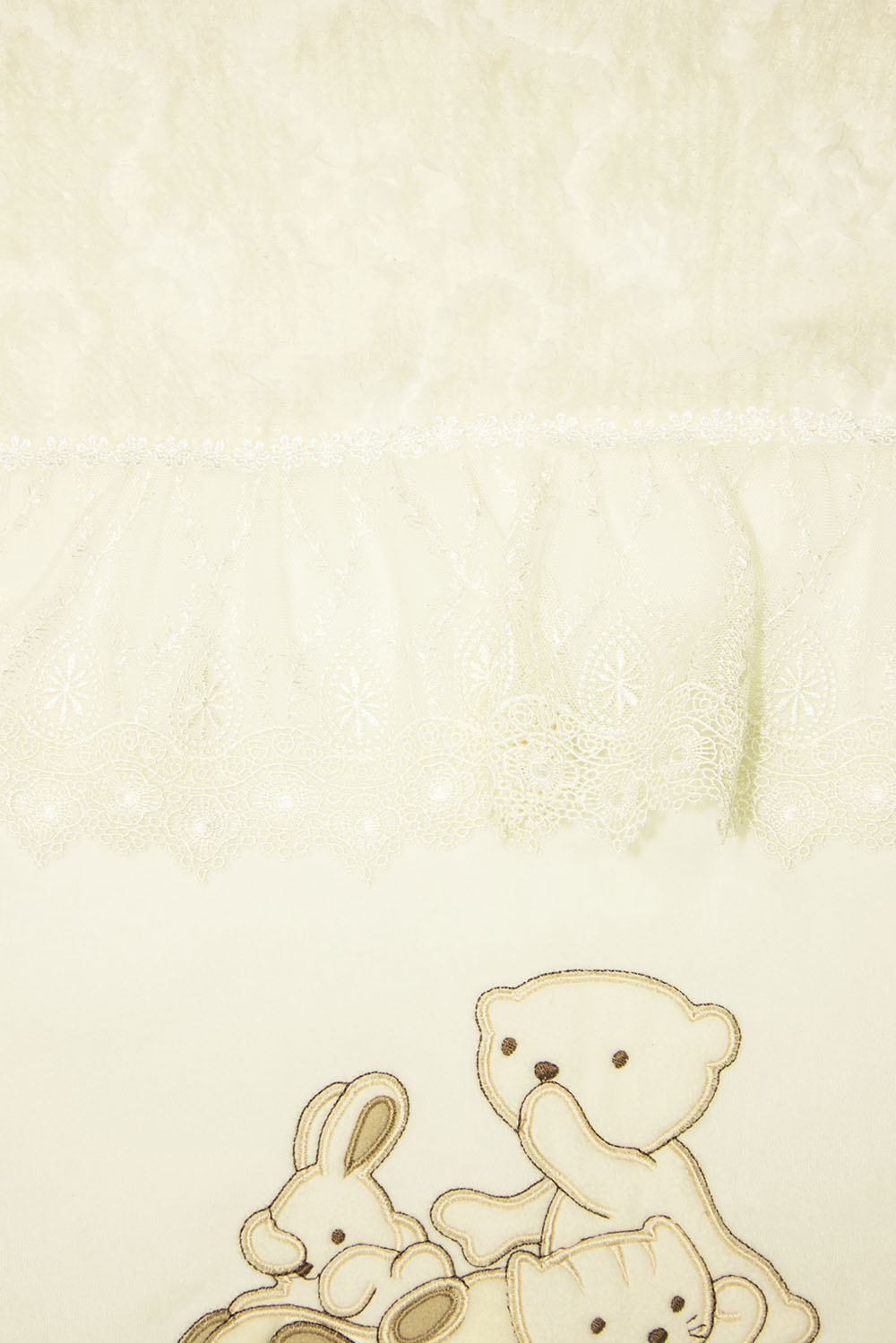 Состав: верх велюр (80% хлопок, 80% п/э), кружево (100%п/э), мех искуственный (100% п/э), подклад кулир (100% хлопок), наполнитель холкон (100% п/э)