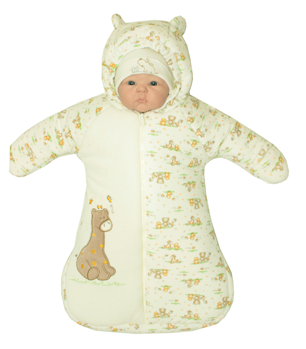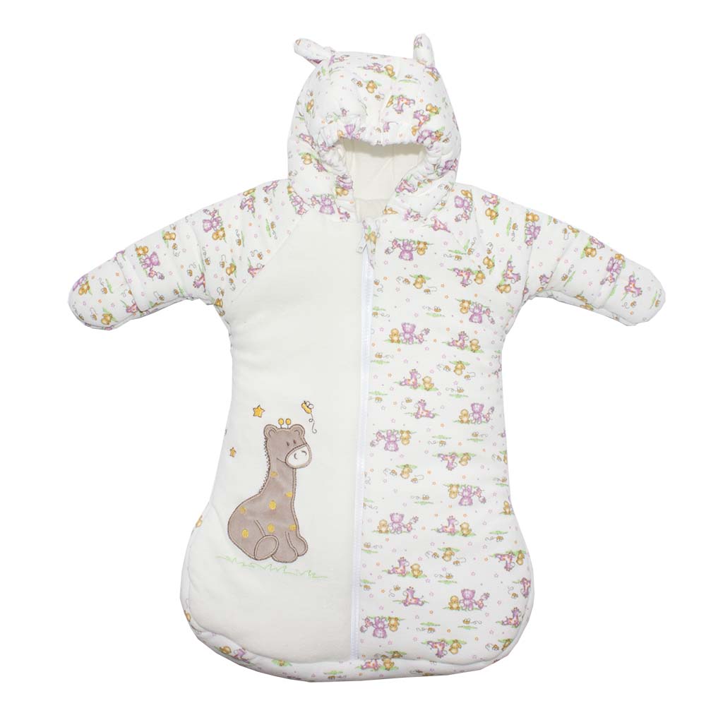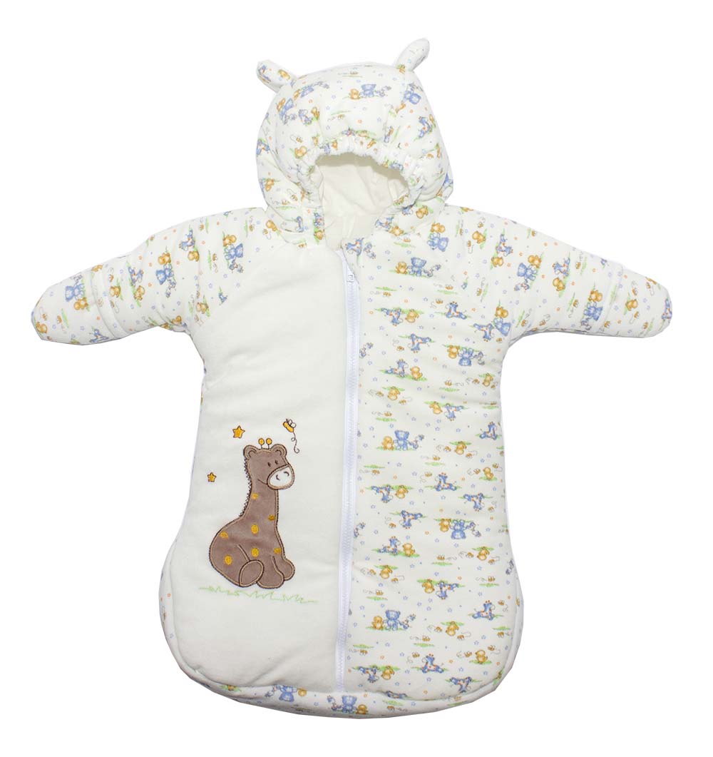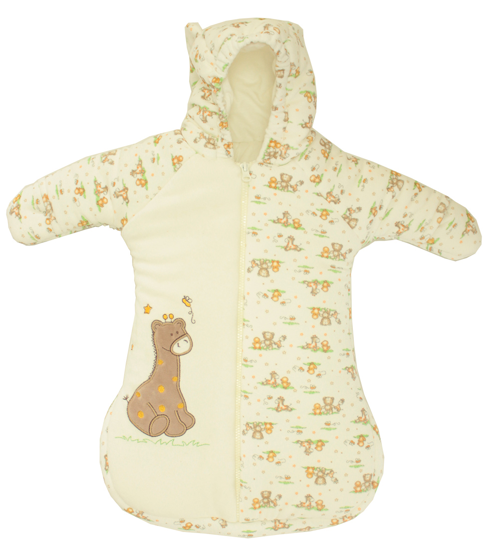 Конверт демисезонный из велюра. Конверт предназначен для прогулки для детей от 0 до 3 месяцев. Выполнен из высокачественного велюра молочного цвета с набивным рисунком и украшен вышивкой "Жирафик". Конверт теплый, благодаря специальному гипоаллергенному наполнителю. Комфортен даже для новорожденного малыша, так как имеет хлопковую подкладку. Состав: велюр (80% хлопок, 20% п/э), подклад кулир (100% хлопок) и наполнитель холкон (100% п/э).