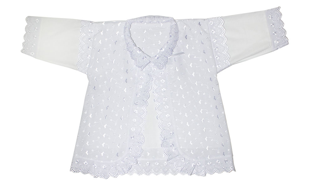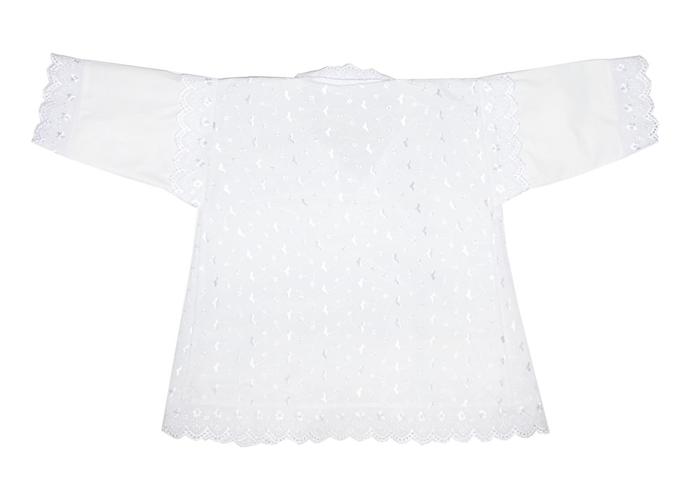 Крестильный набор состоит из рубашки и уголка. У рубашки широкий ворот и подол, а также красивая завязка на ленте, чтобы было удобно надевать на ребенка. У рубашки двойной слой: первый слой - хб тонкое полотно, а второй слой - нарядный кружевной. Уголок также был украшен нарядным кружевом. Размер уголка: 80смна80см.